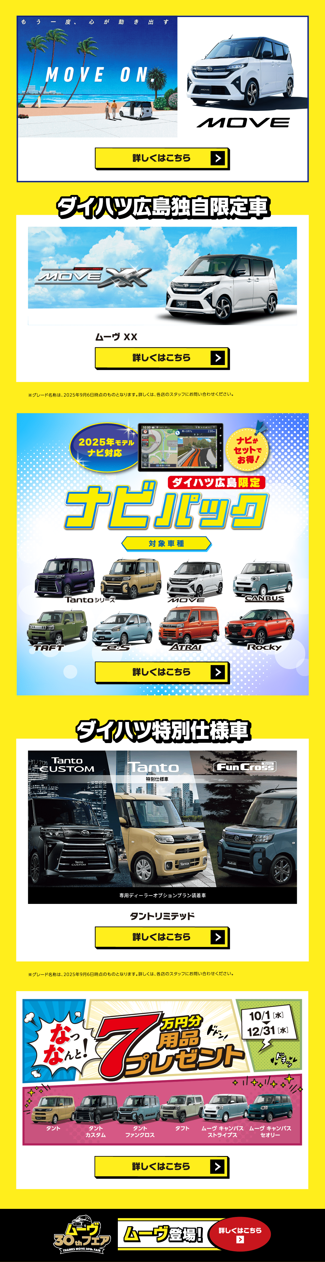 MOVE ON ダイハツ広島独自限定車 ナビパック ダイハツ特別使用車 7万円用品プレゼント 実施店舗はこちらから ムーヴ登場