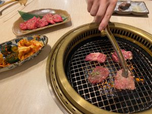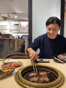店内の雰囲気を伝えるため、僕がお肉を焼いている写真も載せておきます(笑)。