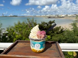 👆ウミカジテラスで絶景を見ながら食べたサーターアンダギーパフェ🍦🍩💙