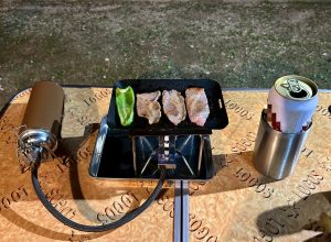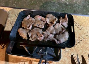 月を眺めながら、ビールを片手に、シングルバーナーに小さな鉄板をのせて、ひとり焼肉。