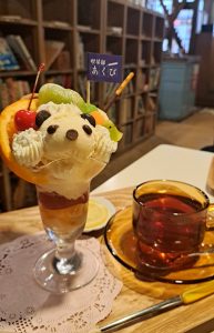 写真に写っているすべてが可愛すぎませんか、、📸🐼💖プリンが喫茶店の優しい味で美味しかったです🍮💗パフェに乗っているクッキーがあくびしている女の子で可愛かったです👩🍪それなのに、、!!写真を撮らずに食べちゃいました、、😢アイスとフルーツが沢山入っていてとっても美味しかったです🍦🥝🥺💞私の誕生日が近いこともあって同期がごちそうしてくれました😻🎂✨