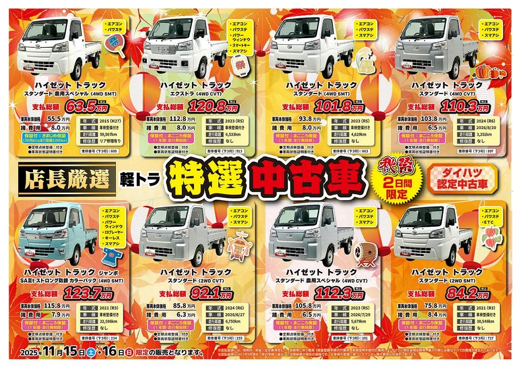 店長の末岡が厳選した特選中古車を2日間限定で販売いたします。