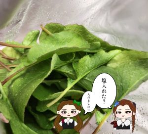 袋に葉・塩を入れて塩もみをしました🧂🍃塩はひとつまみです🧂✊