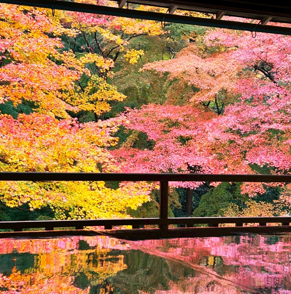 彩り豊かな紅葉が机に映し出されている美しいリフレクション🍁