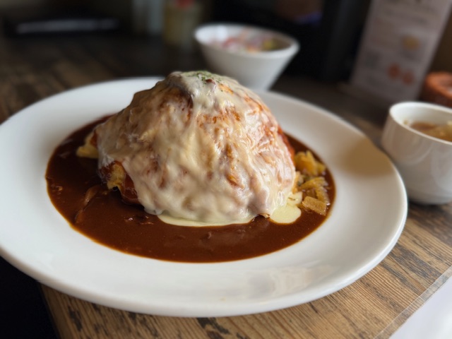 ケチャップライスにデミグラスソースさらに上にチーズをかけてあるオムライスです🍳🧀