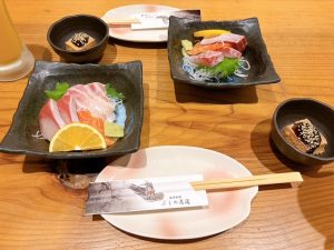 最初にお通しとお刺身が運ばれてきて「美味しそうだね~」と話していると…