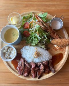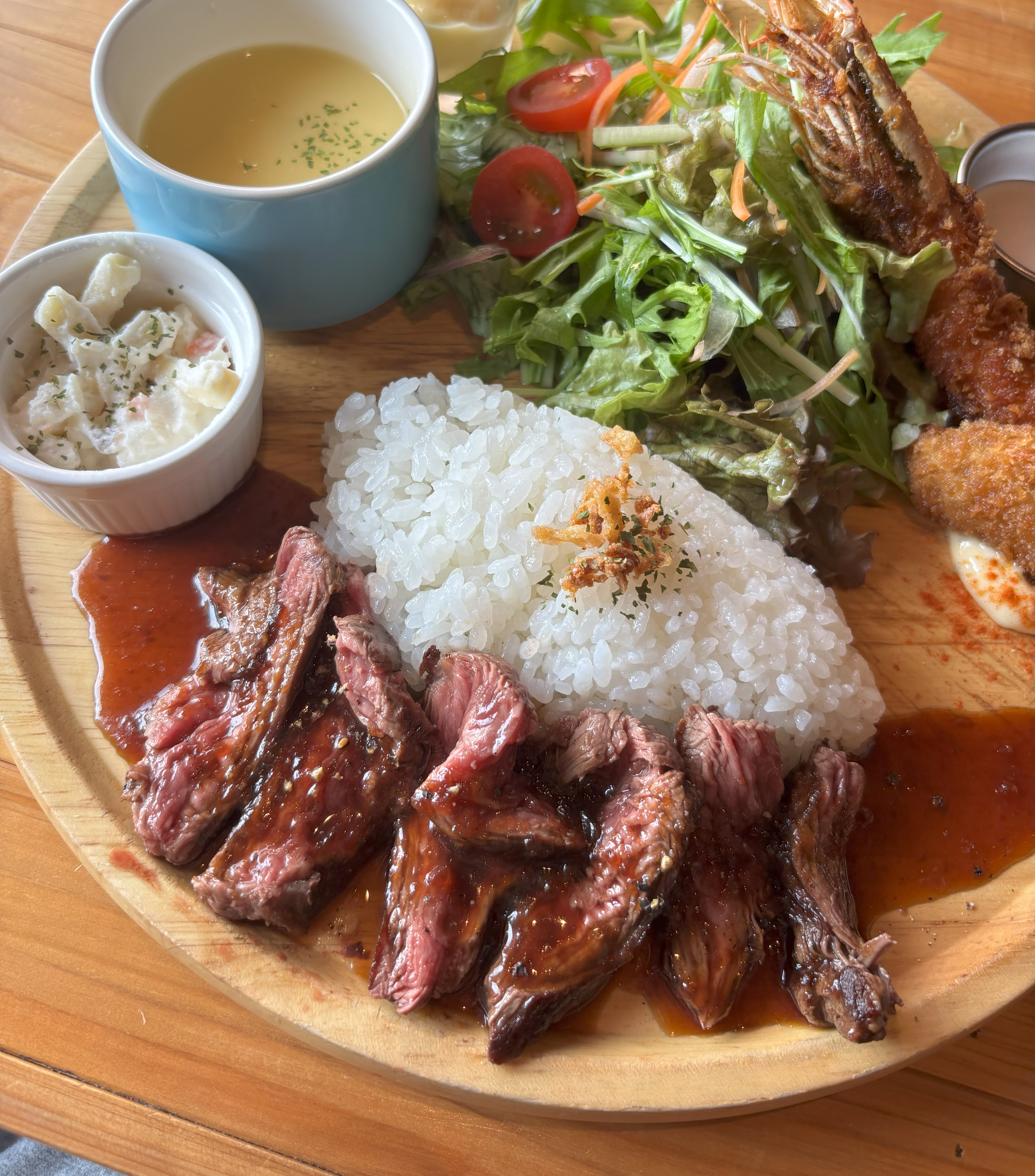 ハラミにエビフライ、サラダにスープとボリューム満点です✨