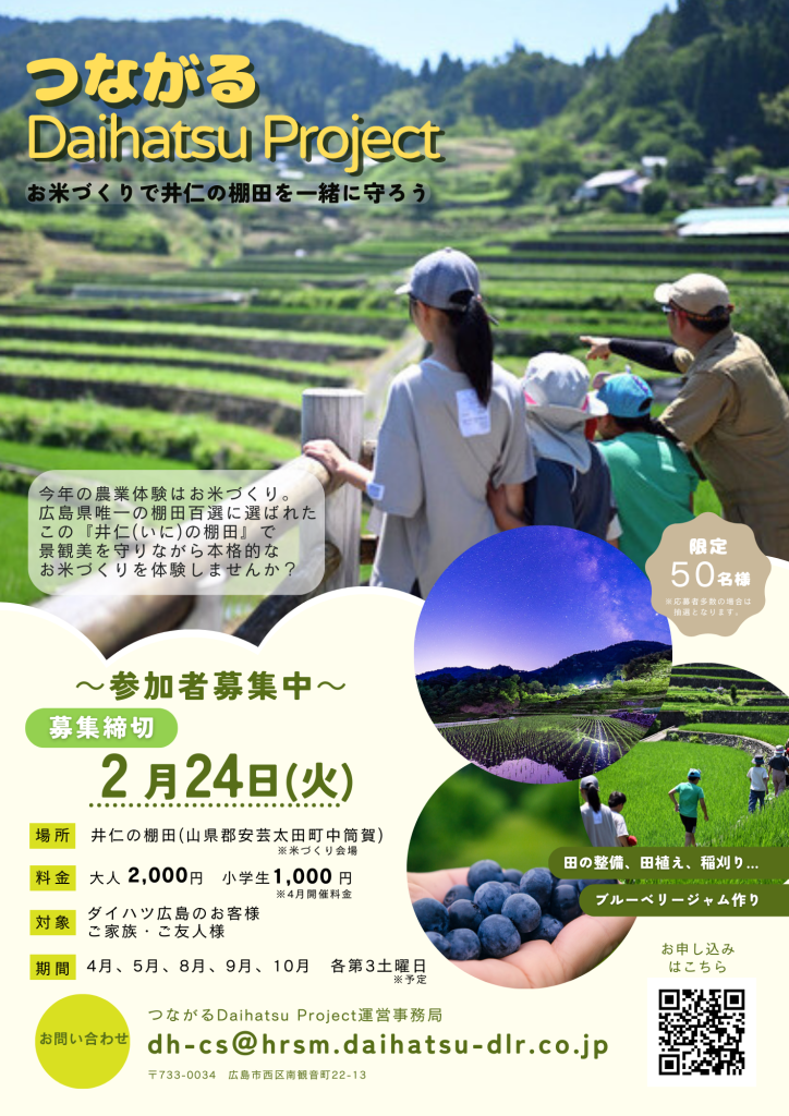 今回の農業体験は『つながるDaihatsuProject』活動の一環として開催します。広島県唯一の棚田百選に選ばれた「井仁の棚田」を、景観美を守りながら一年を通してお米づくりを体感しませんか?