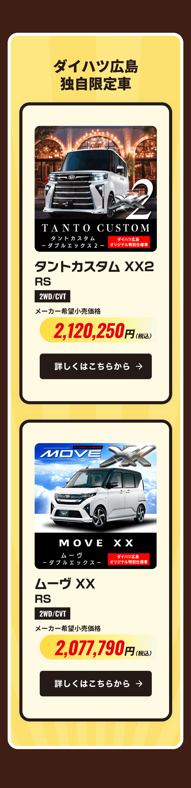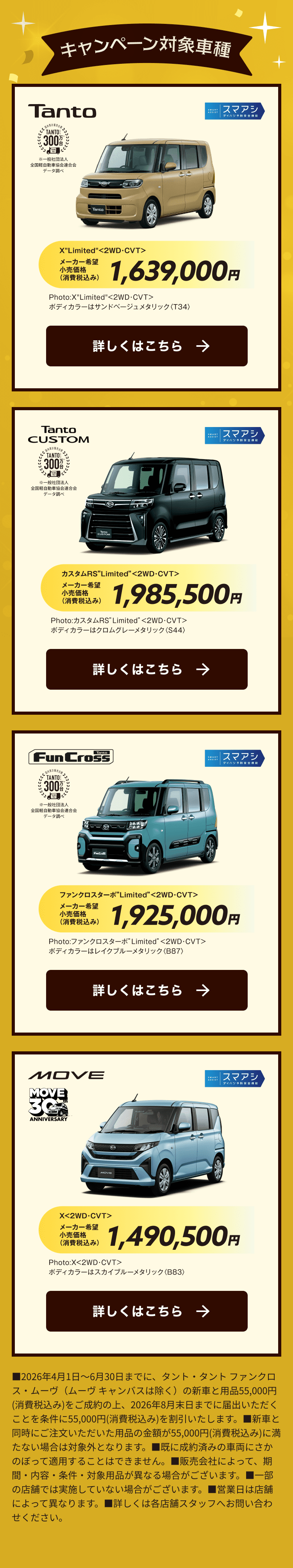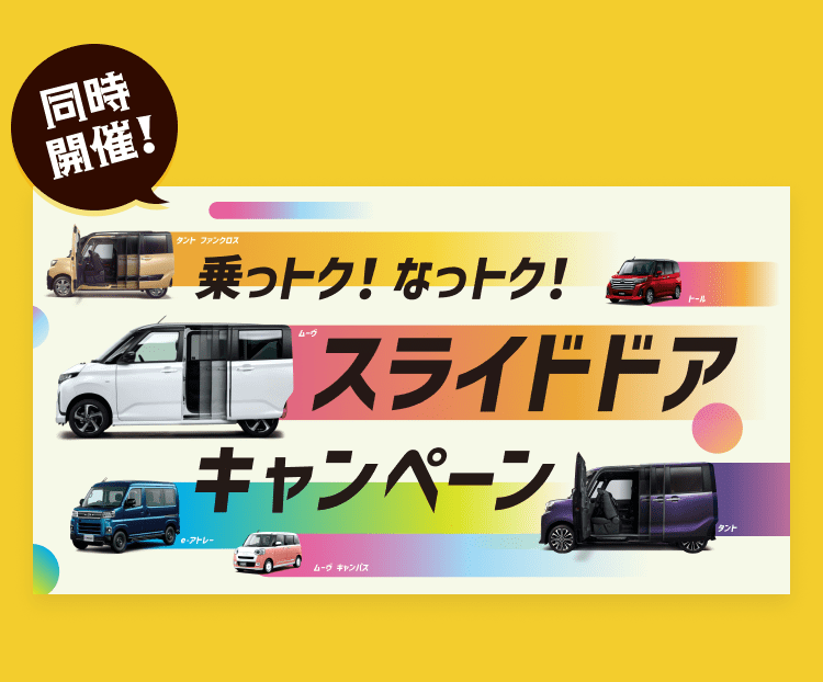 タントの詳しい情報はこちら タント カスタムの詳しい情報はこちら ファンクロス ターボの詳しい情報はこちら ムーブの詳しい情報はこちら タントカスタム ダブルエックス2 RSの詳しい情報はこちら ムーブ ダブルエックス RSの詳しい情報はこちら 乗っトク!なっトク!スライドドアキャンペーン オンライン見積もりはこちら オンライン商談はこちら 展示車・試乗車検索はこちら 中古車取扱店を店舗一覧から探す場合はこちら スマートカーライフパッケージのご紹介はこちら