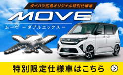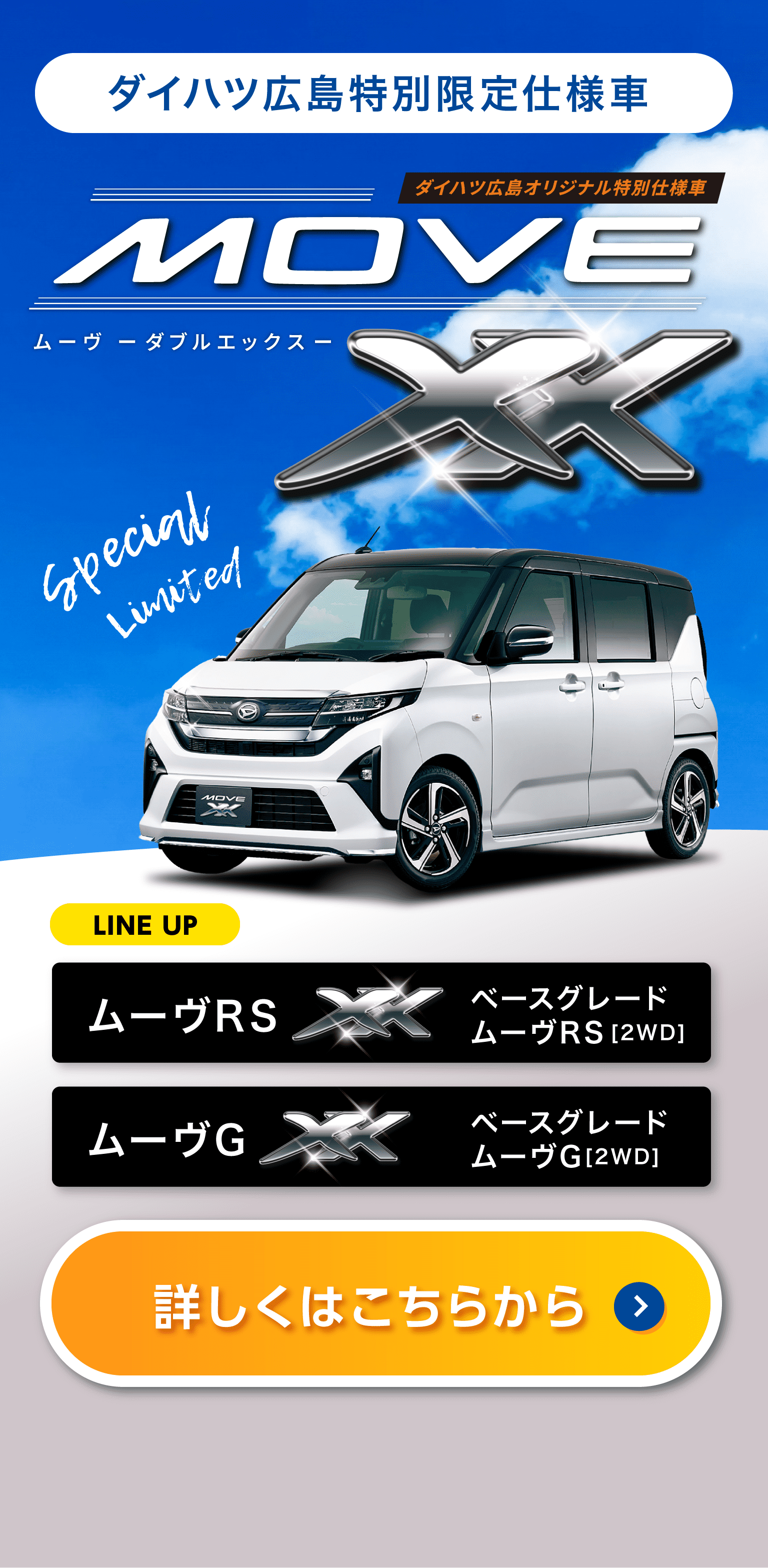 もう一度、心が動き出す。MOVE ON. TO A NEW STYLE. 新しいスタイルへ。 一人の時間も、人との時間も特別にする。 ベストショットは、今日そのもの。 TO A NEW STANDARD. 新しいスタンダードへ。 気がついたら、よろこぶ顔を想像していた。 ANOTHER STYLE DANDYSPORT STYLE NOBLECHIC STYLE SLIDE DOOR 狭い場所でも、荷物があっても。いつもの乗り降りをスムーズに。 ウェルカムオープン機能 タッチ&ゴーロック機能 SMART ASSIST スマートアシストの17種類の予防安全機能 その他の安全機能 スマアシページへ移動します GRADE LINEUP RS、X GRADE LINEUP G、L COLOR VARIATIONS MONOTONE COLOR VARIATIONS TWOTONE カーライフ、安心したい。トクしたい。 スマパケのサービスとは ページ内ワンクレ情報へ移動します ページ内ツイン情報へ移動します ワンダフルパスポートページへ移動します クレジット一体型保険ページへ移動します ダイハツdeライト保証ページへ移動します ポイント楽バックページへ移動します 店舗情報ページへ移動します ワンダフル クレジット お支払い例 RS お支払い例 X お支払い例 G お支払い例 L ワンダフル ツイン 1回目のお支払い(購入時) お支払い例 RS お支払い例 X お支払い例 G お支払い例 L ムーヴXXの紹介PDFへ移動します