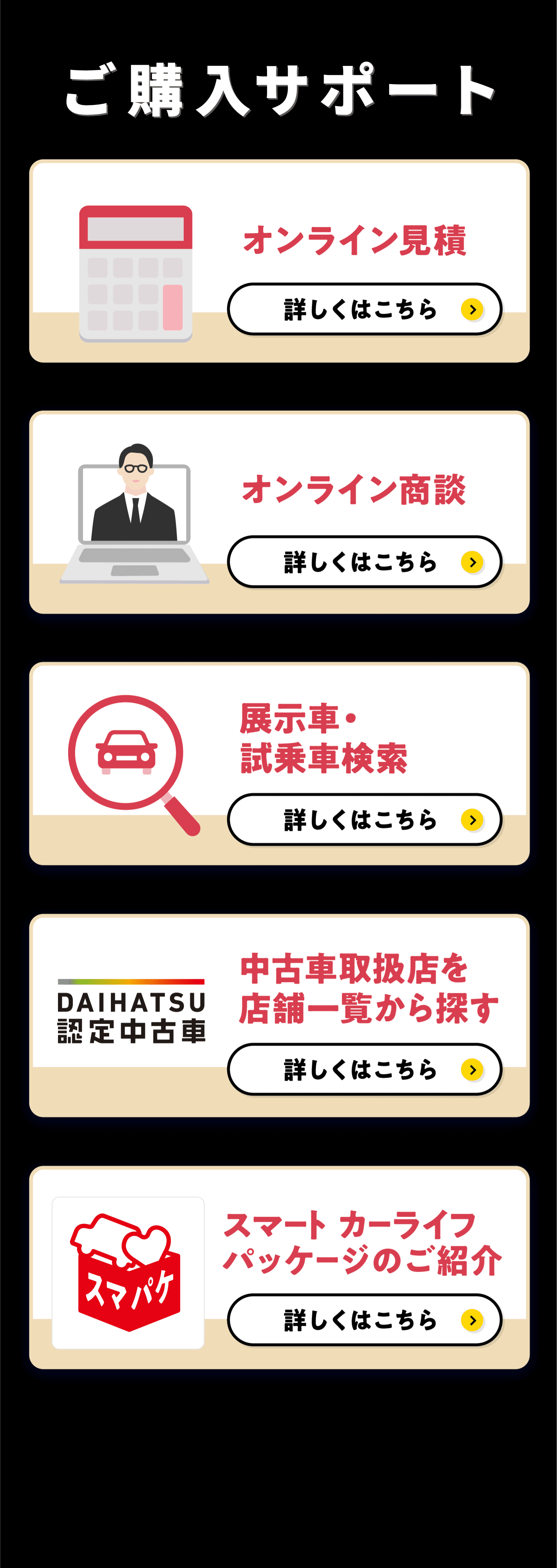 オンライン見積ページはこちら オンライン商談ページはこちら 展示車・試乗車検索ページはこちら 中古車情報 スマートカーライフパッケージの紹介ページはこちら