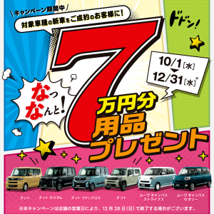 News 最新のニュース キャンペーン(新車) 用品7万円分プレゼントキャンペーン 2025-10-01 対象の新車をご成約のお客様に 用品7万円分をプレゼント! 詳細は→(こちらから) ■純正用品とは■ 車の納車前にダイハツ広島の工場で取り付ける アクセサリー用品のこと (=ディーラーオプション) 前の記事へ 一覧に戻る 次の記事へ