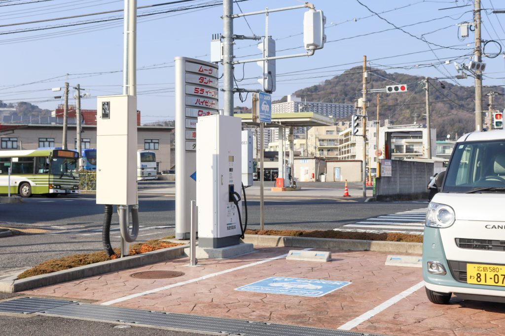 カーシェアステーション横に給電スポットを設置しております。 お近くにお越しの際はぜひご利用ください。 (24時間営業/急速充電)